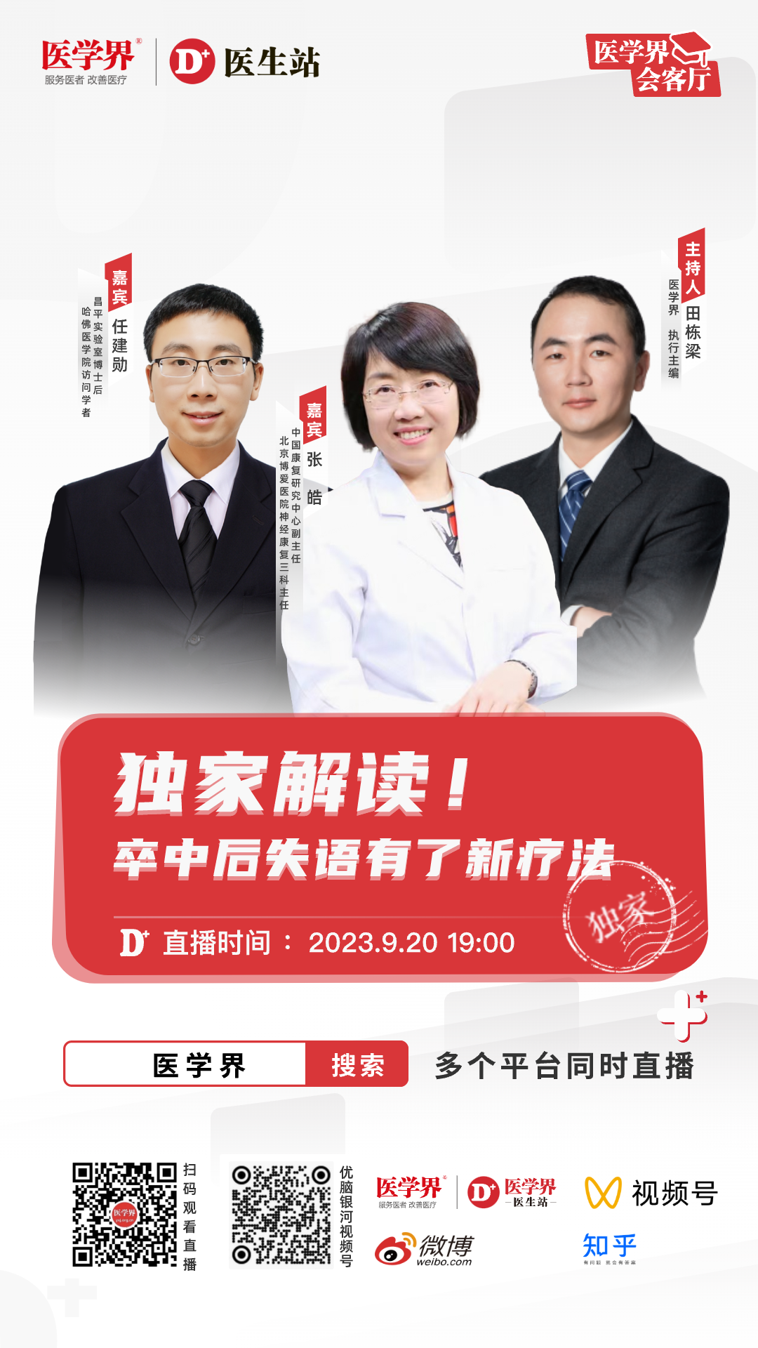 医学界会客厅直播间,将邀请中国康复研究中心北京博爱医院神经康复三科主任张皓教授和哈佛医学院访问学者任建勋博士,来给大家讲解“卒中后失语症的新疗法”。