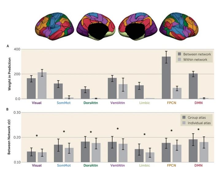 研究使用了65名儿童时期遭受过虐待,现确诊PTSD的女性受试者的静息态功能核磁成像数据。通过Multidimensional Inventory of Dissociation(MID)量表测评了患者分离的严重程度。研究人员在每个受试者个体上定位了92个功能感兴趣区域(ROI),并使用机器学习方法根据个体的功能连接来预测MID分数,结果发现某些特定脑区之间的功能连接可以稳定地预测MID分数,且这个预测的分数与实际MID分数显著相关。这些功能连接中, 默认网络和额顶控制网络之间的功能连接在预测模型中贡献最大。为了确认个体功能网络在其中的重要性,研究人员又使用了组水平的功能网络模版来重复上述研究。由于人脑功能网络个体差异大,把组水平的功能网络模版不加区分地套用到不同的个体,就无法正确反映每个人大脑的功能连接情况,最后造成预测的分数与实际分数的相关性大大降低。