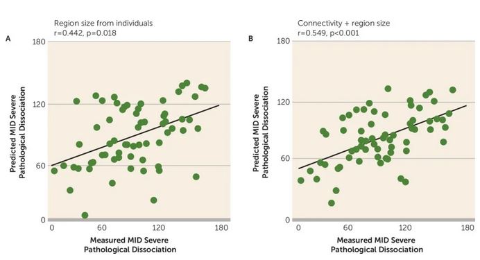 同时,除了脑区之间功能连接的强度与症状有关,研究人员也发现每个人的功能区域的大小也能够预测MID分数。把功能连接与功能区域大小这两个特征结合起来,能够更好地预测分离症状的严重程度。