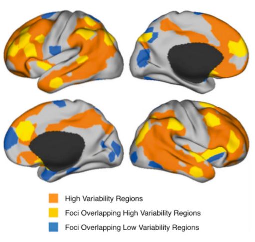 研究团队进一步基于Pub-Med上的15个共573位被试的研究数据进行元分析数据验证,与认知和行为相关的脑区个体差异较大,含与性格特质,记忆力,焦虑,风险偏好,反应抑制,智力等脑区,其中73%与个体功能图谱高度差异的区域重合, 证明负责认知脑区具有高度的个体脑功能图谱差异。