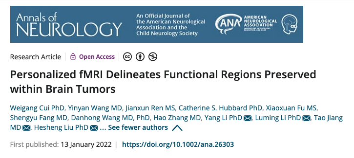 Cui, W., Wang, Y., Ren, J., Hubbard, C. S., Fu, X., Fang, S., ... & Liu, H. (2022). Personalized fMRI delineates functional regions preserved within brain tumors. Annals of neurology.