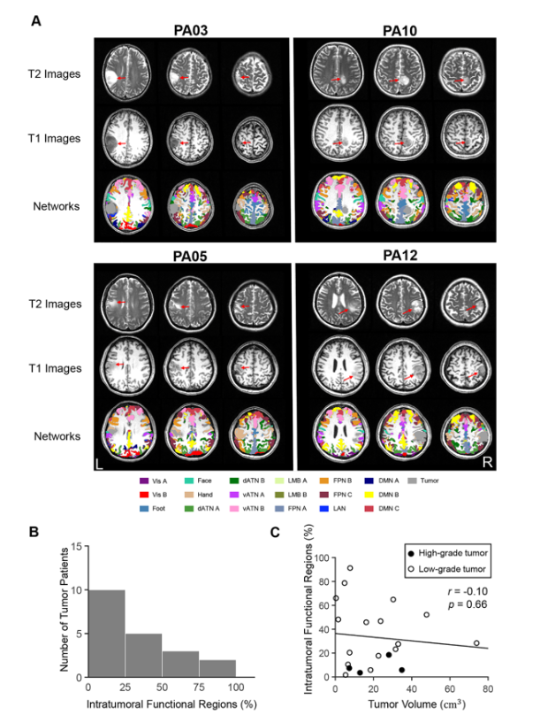 本研究在前期开发的独创性技术个体化脑功能剖分技术(pBFS)剖分的18个体脑功能网络的基础上,通过对20名脑肿瘤患者进行静息态磁共振扫描,结合了脑肿瘤特点,通过迭代和半球优化策略,为每位脑肿瘤患者绘制出了个体化的脑网络,包括18个脑功能网络和1个肿瘤网络(tumor network)。结果发现患者肿瘤内存在平均33.2%的 “瘤内功能区(intratumoral functional regions)——即脑肿瘤内具有脑功能活动的区域”。