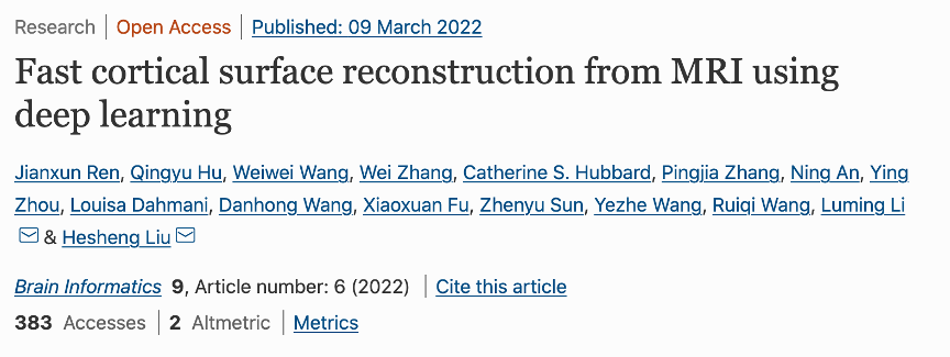 2022年3月,刘河生教授团队开发了一种高效的大脑皮层重建方法,论文 “Fast cortical surface reconstruction from MRI using deep learning” 发表在神经计算科学期刊Brain Informatics。该基于深度学习的创新性算法FastCSR (fast cortical surface reconstruction ),克服了传统FreeSurfer皮层重建耗时长的瓶颈,将原长达数小时的皮层重建时间缩短到5分钟内,将全数据预处理流程效率提升约47倍,对于大规模的脑影像数据处理可以节省大量的算力和时间成本。同时FastCSR皮层重建质量优于传统算法,更适用于低数据质量和脑部有变形的患者(脑肿瘤、脑卒中、脑手术等)的皮层重建过程。FastCSR能够提升科研、临床影像数据分析效率,为脑影像领域的大样本研究提供了更加高效、节俭的方法。