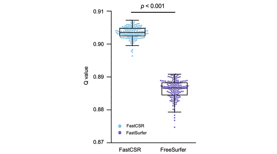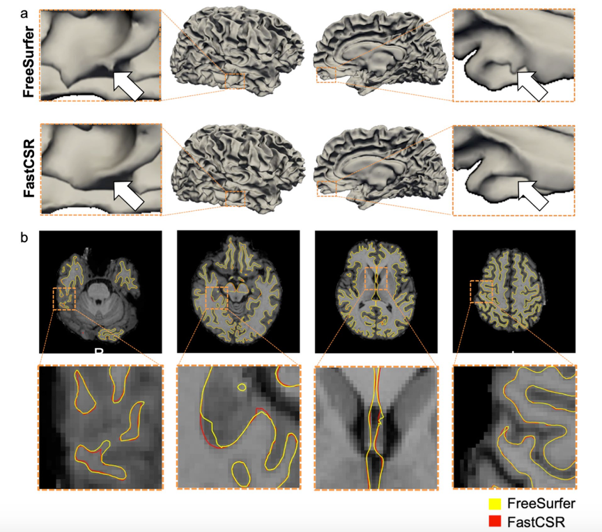 研究团队基于深度学习创新性开发了一种皮层重建技术FastCSR,与同类处理方法相比,大幅提升重建效率,具有更高质量的图像处理性能的同时兼备普适性和稳定可重复性,并适用于低数据质量和脑部有变形的患者(脑肿瘤、脑卒中、脑手术)的影像数据处理,对临床中需要进行快速且准确皮层重建的应用场景提供了一个新技术。