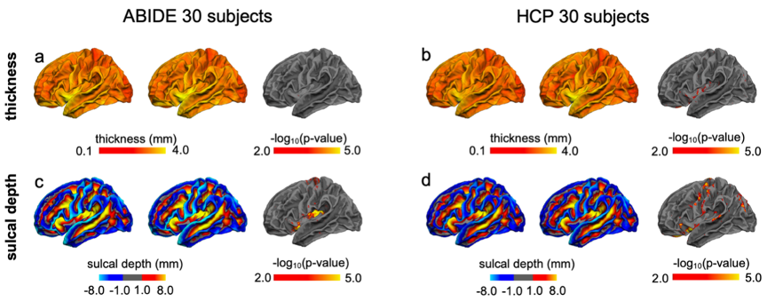 由于FastCSR采用深度学习方法,依赖于训练数据库,需要验证相较于训练模型中不曾出现过的不同特质数据,该算法能否同样适用。研究人员利用新增的30位ASD被试和30位健康被试(更高分辨率)的数据进行验证,结果表明FastCSR和FreeSurfer所重建的皮层厚度和沟回深度具有高度的一致性。在ASD数据组(ABIDE),有0.07%的顶点皮层厚度具有差异,沟回深度有2.44%的顶点具有差异异,差异点主要位于脑岛、中央前回、眶额叶;同样的,正常被试数据组(HCP)皮层厚度有2.16%的顶点具有差异,沟回深度有5.87%的差异。