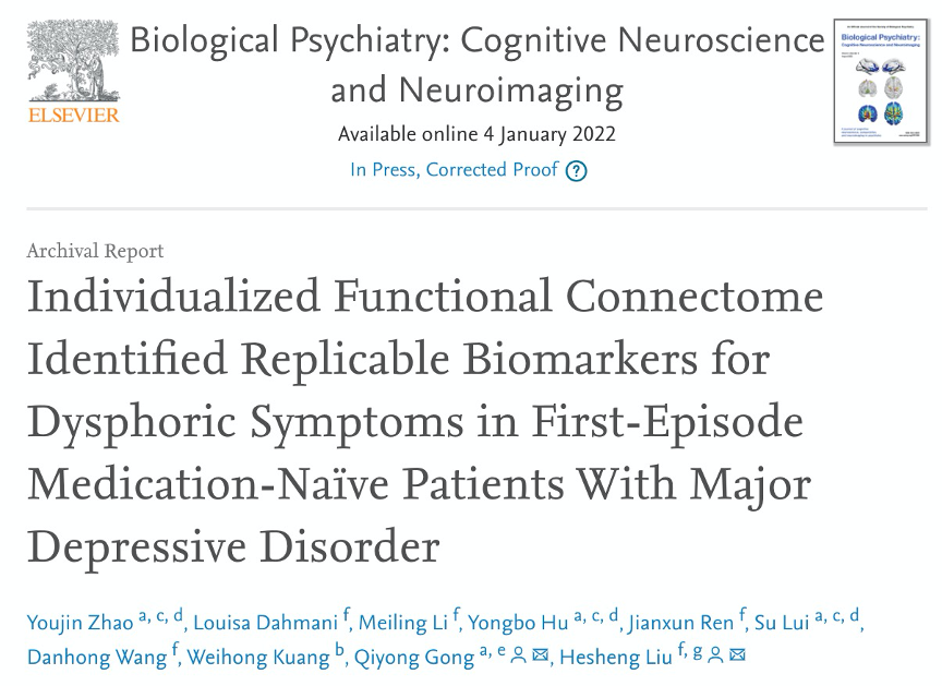 Zhao, Y., Dahmani, L., Li, M., Hu, Y., Ren, J., Lui, S., ... & Liu, H. (2022). Individualized functional connectome identified replicable biomarkers for dysphoric symptoms in first-episode medication-naïve patients with major depressive disorder. Biological Psychiatry: Cognitive Neuroscience and Neuroimaging.