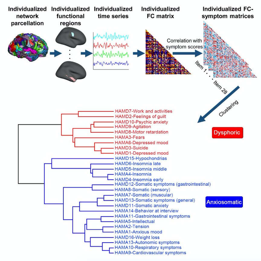 近期,哈佛大学刘河生教授团队与四川大学华西医院龚启勇教授团队合作发现了针对首次发病的抑郁症患者的核心抑郁心理症状(抑郁情绪、兴趣缺失、自杀倾向等)的个体化脑功能影像学生物标记物,论文“Individualized Functional Connectome Identified Replicable Biomarkers for Dysphoric Symptoms in First-Episode Medication-Naive Patients With Major Depressive Disorder” 发表在神经影像学知名期刊“Biological Psychiatry: Cognitive Neuroscience and Neuroimaging”,该论文验证了相较于群组水平的模板,个体化脑功能区剖分方法学在识别症状特异性的影像学标记物时更具有精准性、稳定性和可复制性,并针对异质性高的抑郁症特征进行验证,为研究精神疾病的神经机制和治疗方法提供了新的生物标记物和方法学方向。