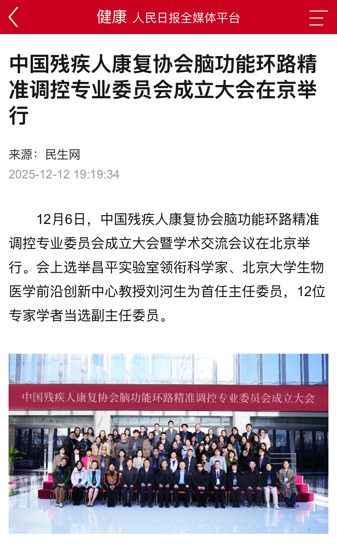 人民日报社民生网报道:中国残疾人康复协会脑功能环路精准调控专业委员会成立大会在京举行