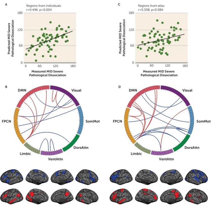 研究使用了65名儿童时期遭受过虐待,现确诊PTSD的女性受试者的静息态功能核磁成像数据。通过Multidimensional Inventory of Dissociation(MID)量表测评了患者分离的严重程度。研究人员在每个受试者个体上定位了92个功能感兴趣区域(ROI),并使用机器学习方法根据个体的功能连接来预测MID分数,结果发现某些特定脑区之间的功能连接可以稳定地预测MID分数,且这个预测的分数与实际MID分数显著相关。这些功能连接中, 默认网络和额顶控制网络之间的功能连接在预测模型中贡献最大。为了确认个体功能网络在其中的重要性,研究人员又使用了组水平的功能网络模版来重复上述研究。由于人脑功能网络个体差异大,把组水平的功能网络模版不加区分地套用到不同的个体,就无法正确反映每个人大脑的功能连接情况,最后造成预测的分数与实际分数的相关性大大降低。