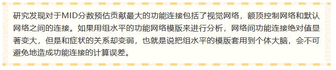 同时,除了脑区之间功能连接的强度与症状有关,研究人员也发现每个人的功能区域的大小也能够预测MID分数。把功能连接与功能区域大小这两个特征结合起来,能够更好地预测分离症状的严重程度。