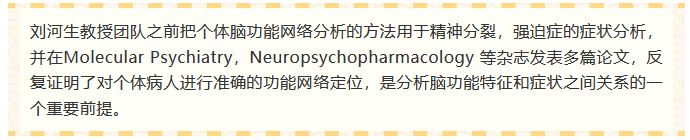 2021年2月,国际顶级精神疾病学期刊 American Journal of Psychiatry 以封面文章的形式,刊登了哈佛大学刘河生教授和Milissa L. Kaufman合作的题为 Large-Scale Functional Brain Network Architecture Changes Associated With Trauma-Related Dissociation的论文。该研究利用个体化脑功能区剖分方法,分析了脑功能连接和“分离症状”的关系。斯坦福大学著名教授Vinod Menon 为此文撰写了专门的评述(参见 http://m6z.cn/63LF75)。