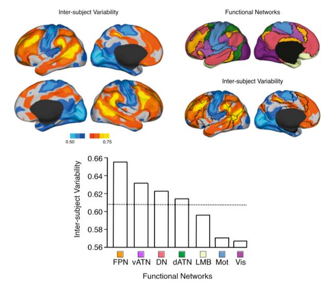 人与人之间的脑功能图谱差异巨大!本研究使用3T核磁共振扫描了23名健康被试的静息态脑功能图谱数据,每人扫描5次,为期6个月;通过数据处理和精确的计算,结果发现人脑个体间的差异最大的在联合皮质,包括外侧前额叶和颞顶交界区域,而初级皮层:感觉皮层和运动皮层的个体间差异最小。个体间脑功能图谱差异较大的区域负责人类复杂的高级认知功能,如推理、语言等;而负责感觉和运动的初级皮层脑区的个体脑功能图谱的差异较小。