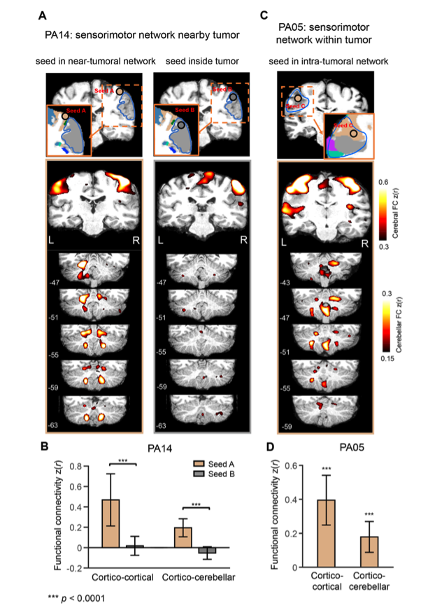 为了进一步验证瘤内功能区的脑功能连接,研究者选取了患者14(PA14)的两个相邻种子点,种子点A位于手部运动功能区,种子点B位于该患者的肿瘤网络。计算这两个种子点的功能连接网络结果表明手部运动区种子点与其对侧大脑和小脑的感觉运动区都具有强功能连接,相反种子点B的大脑皮层-皮层功能连接及与大脑-小脑功能连接都较弱。而另一些患者(PA05)的肿瘤内部存在运动感觉瘤内功能区,研究者选取了位于肿瘤内部运动功能区的种子点进行脑功能连接分析,结果表明该种子点与对侧大脑及小脑的手部感觉运动区均有强功能连接。证明有些病人的脑肿瘤内部仍保存了其脑功能。