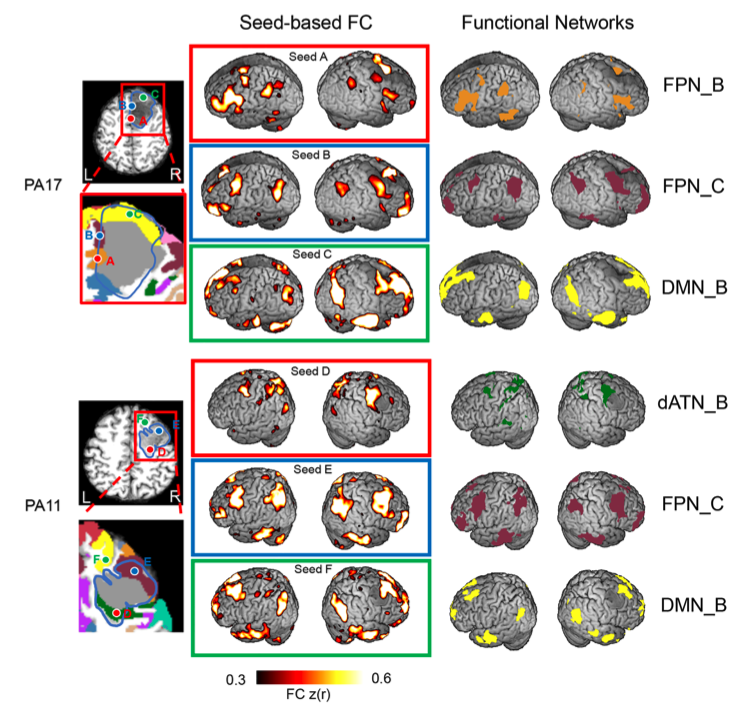 最后,研究者分析了脑肿瘤对高级认知功能的影响,如患者(PA17、PA11)的脑瘤位于额叶,通过该技术将肿瘤区域剖分为肿瘤网络及高级认知功能网络,如额顶执行控制网络,默认网络、背侧注意网络,每位患者选取3个种子点进行脑功能网络分析结果发现瘤内功能区的高级认知功能也具有个体化分布式功能网路的特性,表明瘤内也能保存大脑的高级认知功能。