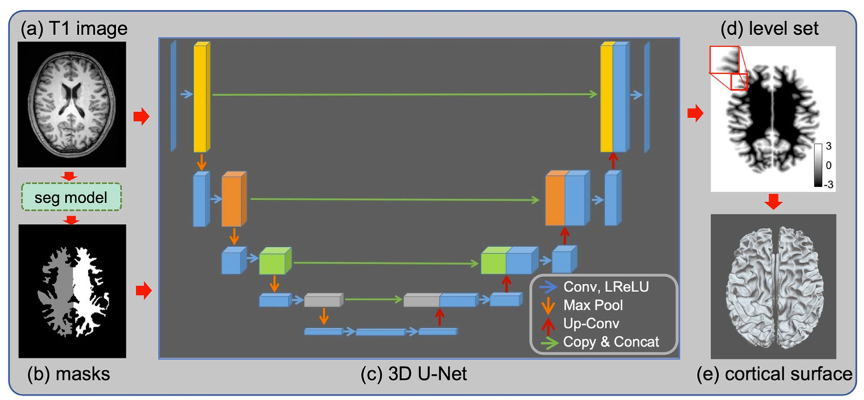 三维空间中的大脑皮层可以看作是由二维空间的皮层表面折叠而成,具有高度个性化的沟回结构。在神经科学的基础研究和临床应用中,对大脑进行MRI扫描后需要进行基于影像数据的皮层重建。现阶段广泛使用的皮层重建技术基于FreeSurfer,计算时间长达数小时,科研和临床工作中仍缺乏能够进行快速处理的大脑皮层重建技术。该研究团队基于深度学习技术通过3D U-Net模型学习T1图像中皮层表面的隐式表示,再基于学习到的隐式表示进行皮层重建,创新性的开发了一种快速皮层重建方法。