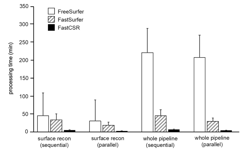 研究人员将FastCSR与当前主流方法FressSurfer、FastSurfer在同样的硬件条件下进行计算对比验证。在包含162名被试的数据集上,使用串行 FreeSurfer 和 FastSurfer 处理流程 进行皮层重建耗时分别为45.06±63.86 min 和 33.64±16.42 min ,而使用FastCSR仅需要5.22±0.92 min;与此同时,并行 FastCSR处理流程可以同时进行大脑双侧半球的计算处理,进一步将计算时间缩短到2.61±0.46 min,大幅提升效率。研究人员分别对三种算法的时间稳定性指标CVPT进行比较,CVPT指标表明FastCSR具有更高的处理时间稳定性。不仅如此,研究人员也对比了整个图像预处理流程的计算时间(含皮层重建步骤),并行状态下Fast CSR算法完成整个数据流程仅需4.44 ± 0.46 min,约47倍快于FreeSurfer (207.19±62.22 min) ,约7倍快于FastSurfer (29.59 ± 9.08 min) ,显著节省计算时间,提高计算效率。研究人员进一步比较了图像分辨率对不同算法处理时间的影响,使用FreeSurfer算法对0.7mm高分辨率T1图像进行皮层重建耗时507.32±470.62 min,17倍慢于其对1.0mm低分辨率T1图像的皮层重建耗时(30.26±59.15 min);而使用FastCSR算法对0.7mm高分辨率T1图像进行皮层重建耗时(3.93±0.06 min),1.5倍慢于其对1.0mm低分辨率T1图像的皮层重建耗时(2.61±0.46 min),证明FastCSR对于高分辨率图像的皮层重建仍然具有优势。