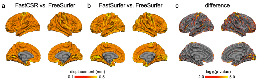 为了量化重建结果的相似性,研究人员对比了FastCSR、FastSurfer两种方法的皮层重建结果相比于FreeSurfer重建结果的平均位移(average displacement),数据显示,这两种方法与FreeSurfer重建结果的差异位置主要位于眶额叶、距状裂、中央前回和中央后回;但是平均位移很微小,最大的位移小于0.5mm,不到半个体素大小;同时两种算法的位移具有显著相关性(Spearman’s ρ=0.71, p<0.001),而在外侧回和视觉皮层FastSurfer的位移显著大于FastCSR。