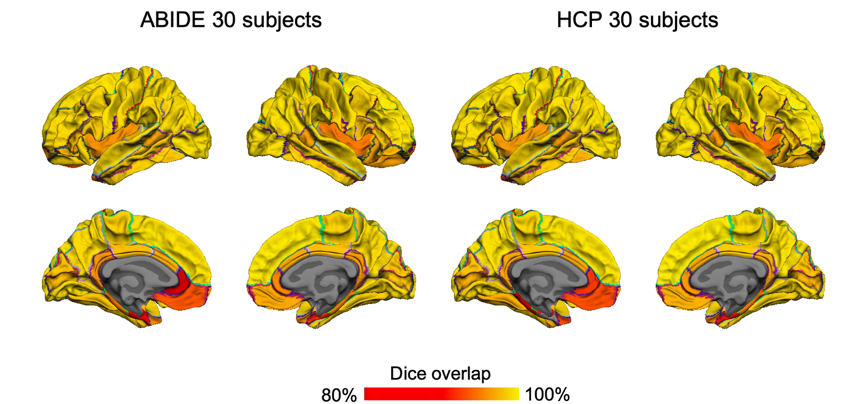 研究人员也对新数据组的解剖结构分区计算进行验证对比,分别用两种算法对34个解剖学分区进行剖分,在ASD数据组,95.59%分区的Dice系数大于0.9,表明具有高度的一致性;在正常被试数据组,94.12%分区的Dice系数大于0.9;结果证明FastCSR对于未知数据集,仍具有良好的适用性,具有普适性。
