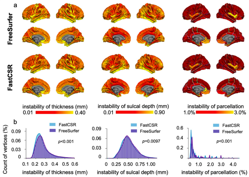 研究人员进一步验证了算法的稳定性。在同一被试接受10次重复T1扫描的公开数据集(CoRR-HNU)上对比FastCSR和FreeSurfer的皮层重建结果,结果显示FastCSR在皮层厚度、沟回深度及解剖分区Dice指标上的稳定性显著高于FreeSurfer;证明FastCSR对相同被试的多次扫描重建结果具有较好的稳定性。