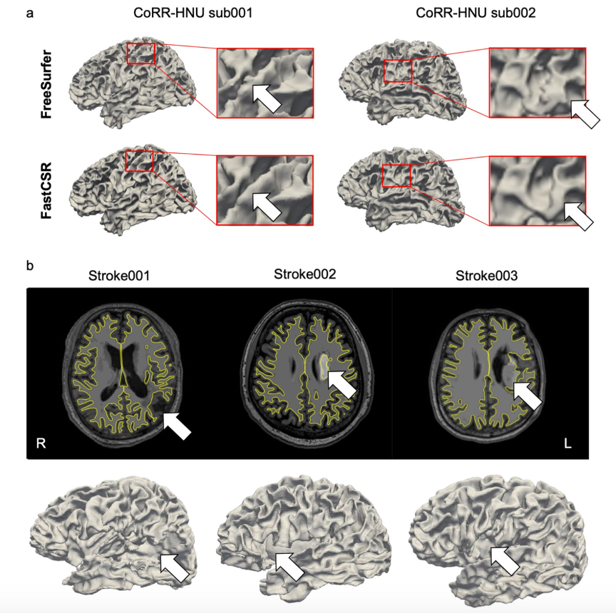 研究团队基于深度学习创新性开发了一种皮层重建技术FastCSR,与同类处理方法相比,大幅提升重建效率,具有更高质量的图像处理性能的同时兼备普适性和稳定可重复性,并适用于低数据质量和脑部有变形的患者(脑肿瘤、脑卒中、脑手术)的影像数据处理,对临床中需要进行快速且准确皮层重建的应用场景提供了一个新技术。